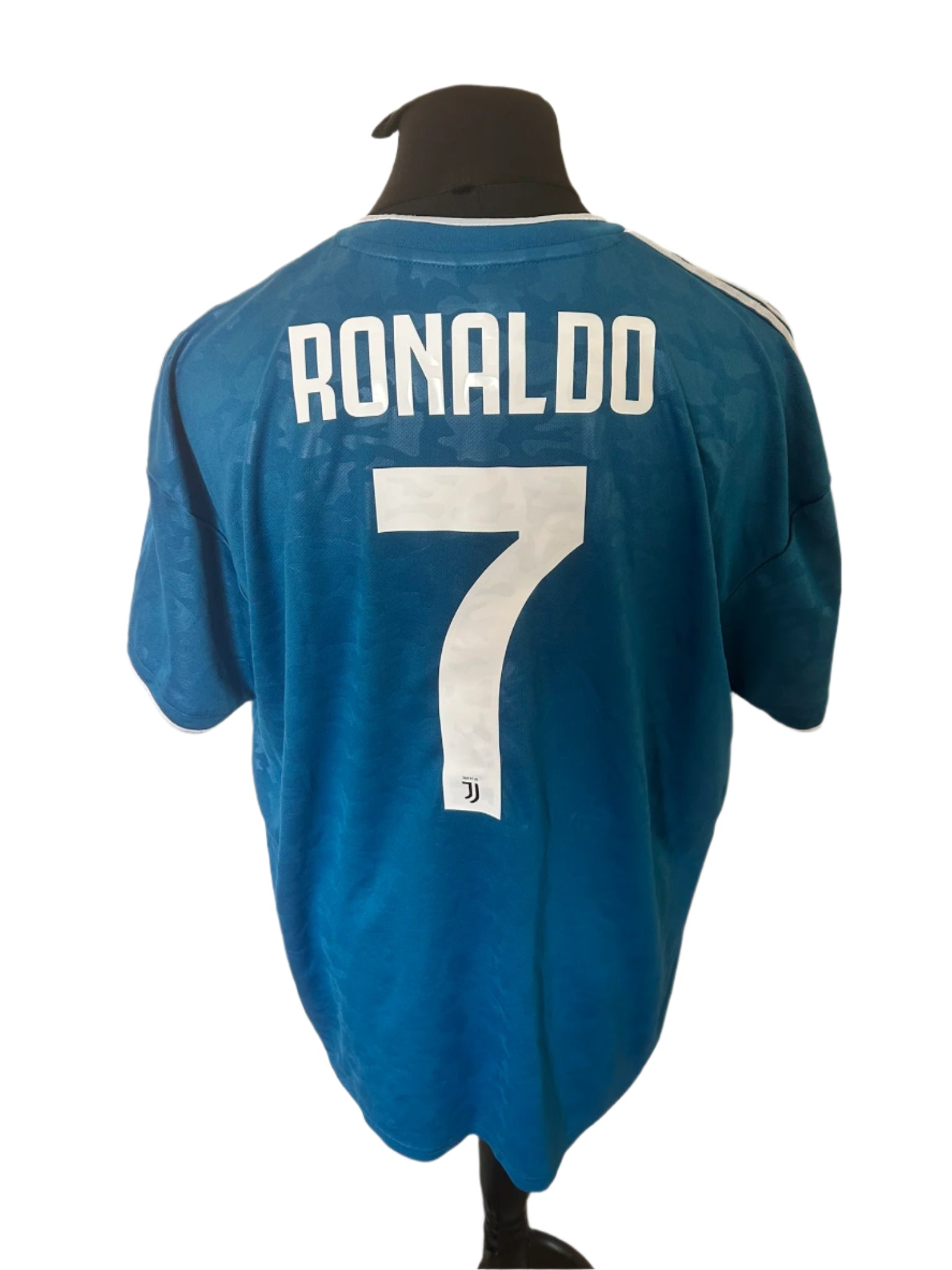 This unique teal football shirt with silver accents was worn by Ronaldo during another prolific season in Turin. Featuring the Juventus crest, Adidas logo, and sponsor detail, it showcases a bold modern design inspired by streetwear fashion, crafted from lightweight, breathable fabric for comfort and performance. A must-have for collectors of classic football shirts and future vintage football shirts, it celebrates Ronaldo’s impact and the club’s contemporary style. Perfect for display or casual wear, this XXL jersey is an authentic and eye-catching tribute to one of football’s greatest-ever players.