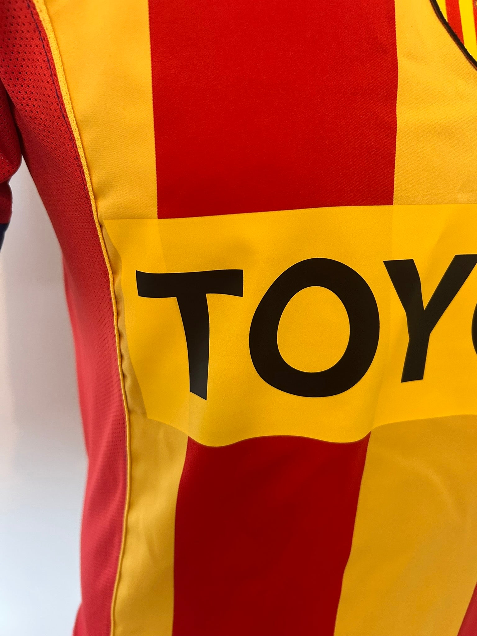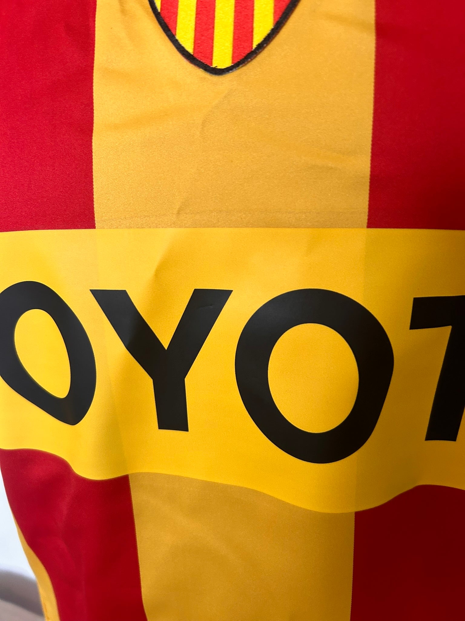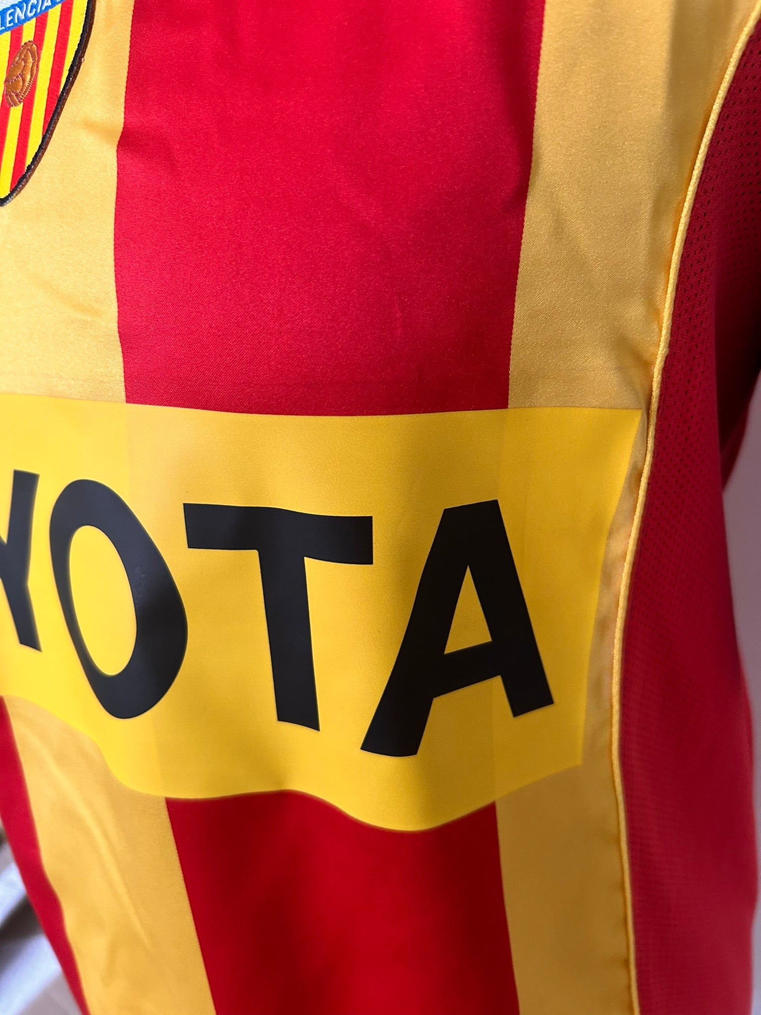 This vibrant yellow and red striped football shirt with bold blue sleeves stands out as a unique design in Los Che’s history. Featuring the Valencia CF crest, Nike logo, and Toyota sponsor detail, it combines striking colours with lightweight, breathable fabric for comfort and performance. A perfect addition for collectors of classic football shirts and vintage football shirts, it reflects the club’s flair and individuality in the mid-2000s. Ideal for display or casual wear, this Small jersey is an authentic and eye-catching piece of Mestalla memorabilia for dedicated Valencia supporters.